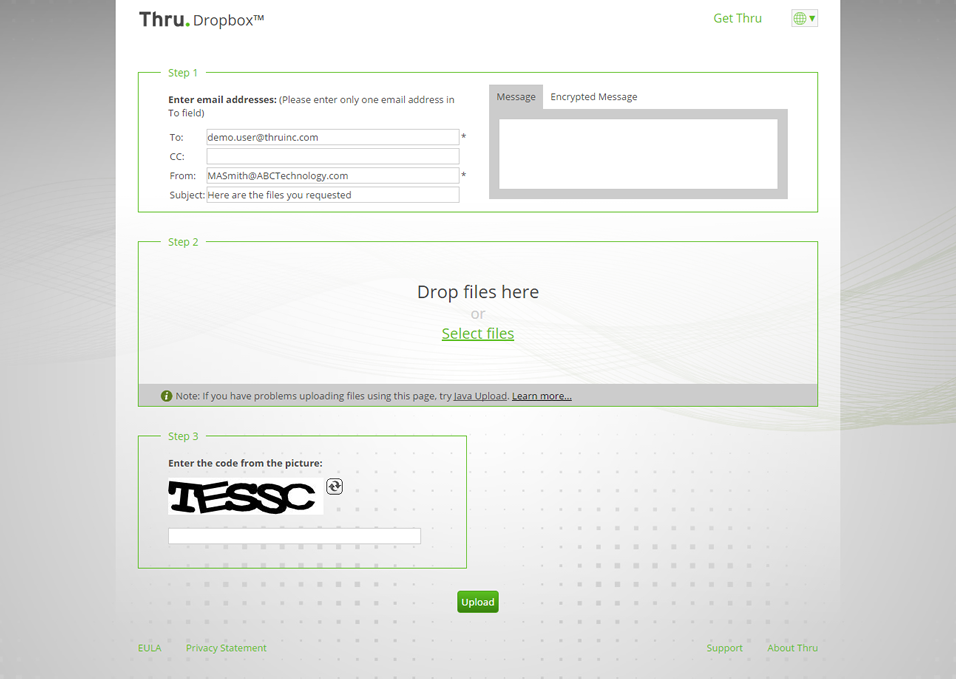 Thru Dropbox allows individuals who do not have a Thru account to easily upload large files to Thru account holders from a simple web upload form. Links to Thru Dropbox pages can be placed on company websites or within email signatures to give external users an easy and secure way to send your users large files.